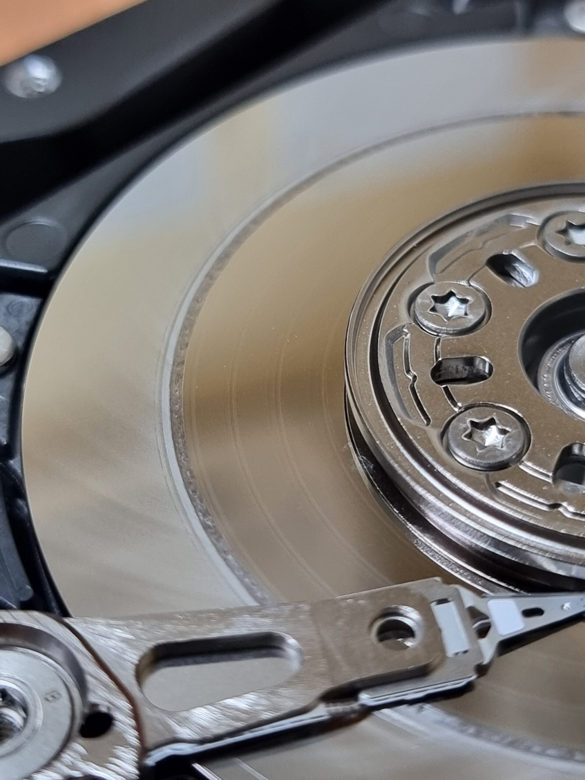 Uszkodzona powierzchnia dysku twarego SAS z serwera.